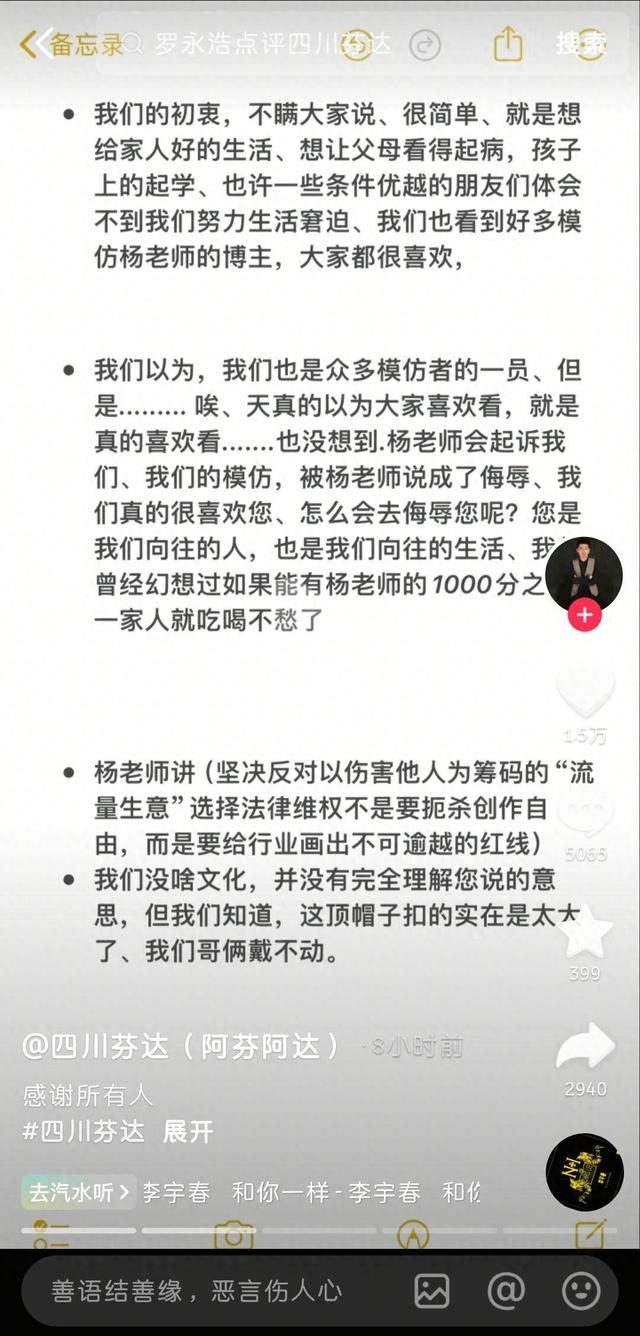 在长文中,四川芬达也承认了自己模仿尺度掌握不当,他们表示自己并非有意侮辱杨坤,尽管杨坤拒绝撤诉,但他们愿意承担法律责任,并赔偿涉及杨坤的直播收益。他们还承诺,从今以后不再模仿杨坤,并恳请杨坤能留一线生机,让他们继续在互联网谋生。