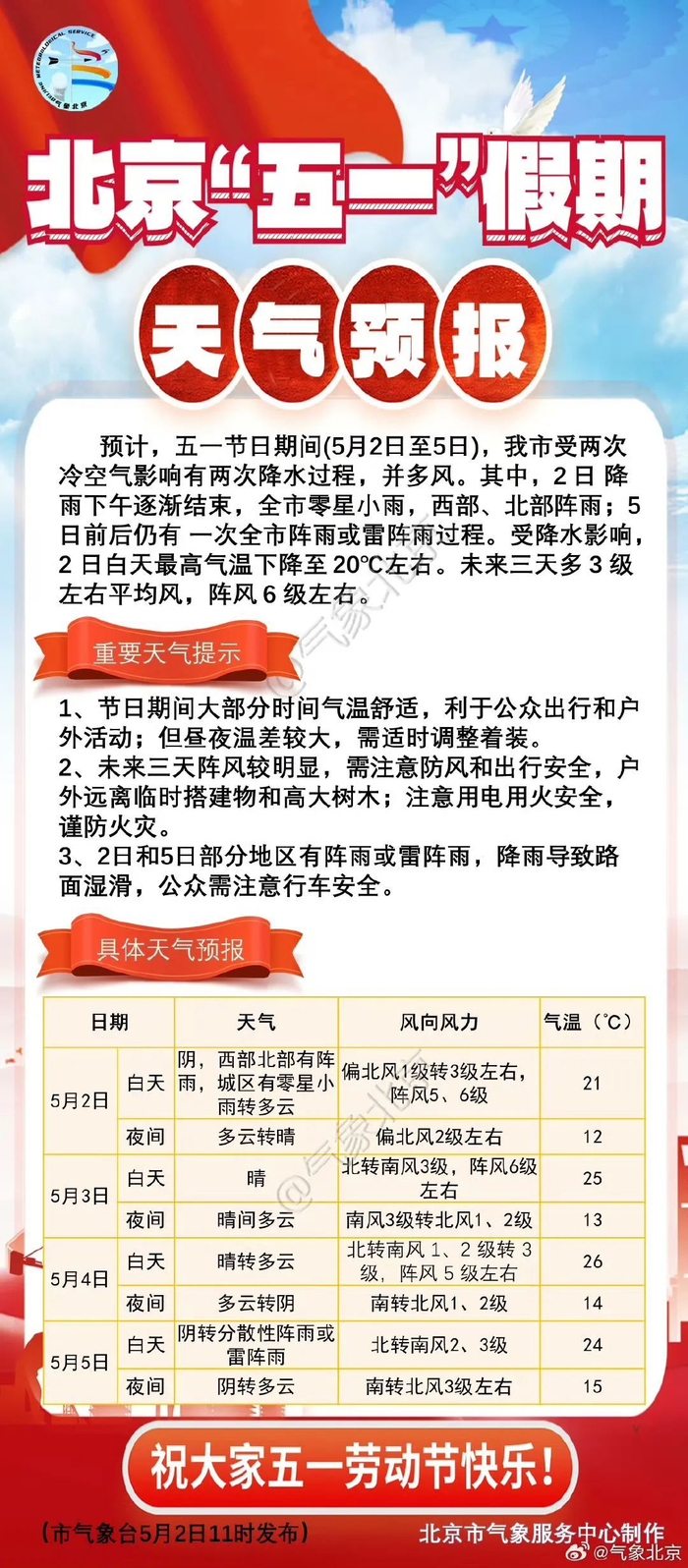这个五一假期冷空气活动有点儿频繁。在今天的风雨过后,明后两天午后阵风仍较明显,假日的最后一天还有一次全市性阵雨或雷阵雨天气。返程的朋友需要注意携带雨具。