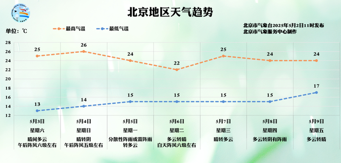 五一节日期间(5月2日至5日),我市受两次冷空气影响有两次降水过程,并多风。其中,2日降雨下午逐渐结束,全市零星小雨,西部、北部阵雨;5月3日白天晴间多云,北转南风3级,阵风6级左右,气温25°C,夜间晴间多云,南风3级转北风1、2级;5日4日白天晴转阴,北转南风 1、2 级转 3级,阵风5级左右;5月5日白天阴转分散性阵雨或雷阵雨。