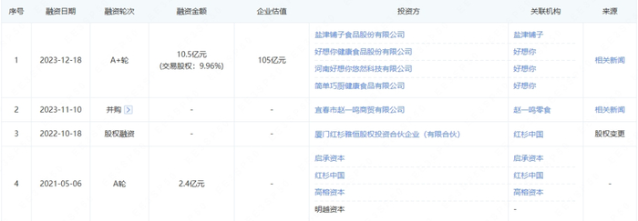 2023年12月,鸣鸣很忙获好想你、盐津铺子控股共同投资10.5亿元。