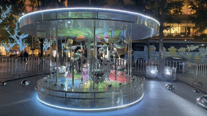 像水晶一样闪耀的“旋转木马”你见过吗?由艺术团队马丁·戈雅生意 MARTIN GOYA BUSINESS创意策划,联合艺术家姚浩澜Top30、尤曜铭Kanes为“闪亮·静安 光影购物SHOW”独家打造国际化光影艺术装置,以常见的旋转木马为制动灵感,改造工业材料与现成品,结合灯光编程,实现日夜有别的视觉光感,打破传统雕塑的单一形态,让一座流光溢彩的神秘岛屿空降静安公园。跨过现实与梦幻童话世界的边界,请以你的身影继续构画这座未知之岛吧!