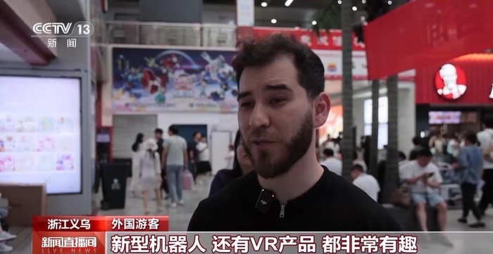 外国游客:我的朋友们是第一次来义乌,他们都很喜欢义乌,因为这里的产品都很有意思,吃住也都很舒适。我们刚刚在体验AR产品、新型机器人、VR产品,都非常有趣。