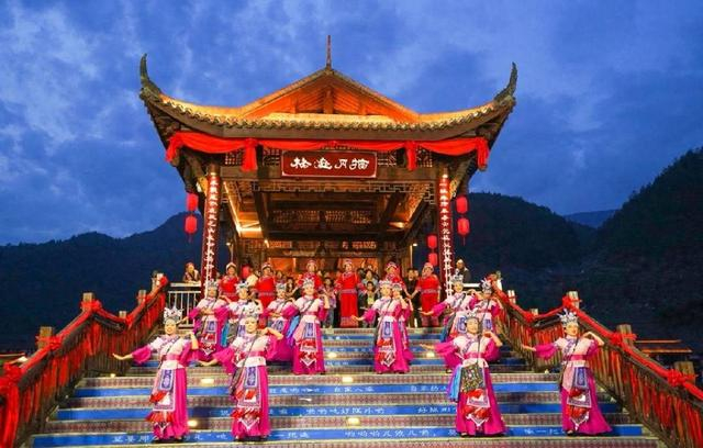 巴王巴后和大祭司率领身着土家盛装的演员,唱响《土家迎客歌》,为游客系上祈福带。沿湖而行,巴人农耕生活场景次第铺展,原汁原味的《薅草锣鼓》表演,风趣幽默,场面十分壮观。
