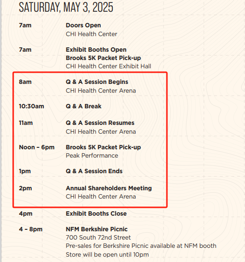 巴菲特在今年2月发布的2024年度股东信中确认,今年传统开场的半小时电影环节取消,股东大会问答则提前一个小时开始,问答上半场从美国奥马哈当地时间5月2日早8点持续到10点30分,休息半小时后,下半场从11点持续到下午1点,即北京时间3日凌晨2点结束。和去年一样,今年依然由CNBC进行问答的全程直播。