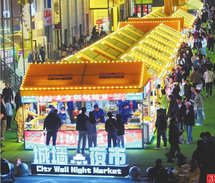 图③:盘锦市双台子区启动城墙夜市,主街上近百家美食摊位吸引了大量游客,人们在品尝特色美食的同时感受城墙古韵,乐此不疲。本报特约记者 潘浩 摄