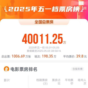2025年五一档电影票房破4亿 环球网 环球网官方账号 2025.05.0309:12 关注 转自:央视据网络平台,截至5月3日8时58分,2025年五一档(5月1日—5月5日)档期内总票房(含预售)突破4亿,影片《水饺皇后》《猎金·游戏》《幽灵公主》暂列前三名。 (总台央视记者 许盼盼)