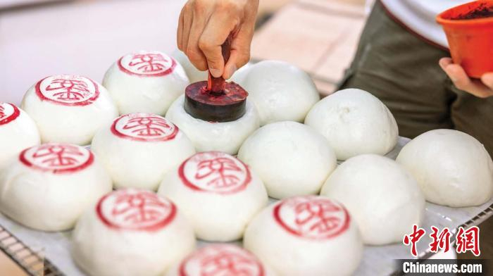 5月2日,屹立长洲岛40年的老字号饼店郭锦记第二代传人郭宇钿接受中新社记者采访时表示,近年来越来越多旅客对长洲岛文化产生兴趣,报名参加平安包工作坊。图为工作坊制作平安包。 (受访者供图)
