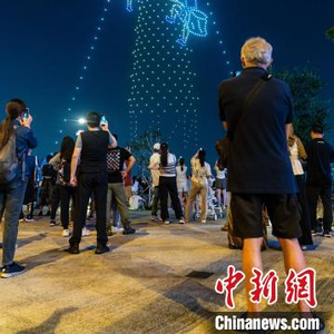 5月1日晚,香港湾仔海滨上演了一场特别的无人机表演,巨型花炮、瑞兽麒麟、长洲太平清醮抢包山等动态图案出现在夜空中,以本地独特的节庆风貌,迎接“五一”访港旅客,展示“打开”香港的另类方式。