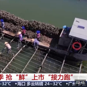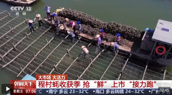 总台央视记者 李啸虎:在国家农业产业强镇广东阳西程村镇,“五一”期间,这里的生蚝迎来大量上市。这片占地六万多亩的生蚝养殖基地里,养殖户正从水下收获一排排成熟的生蚝,40多万箱新捕捞的海鲜正从这里走上百姓的节日餐桌。