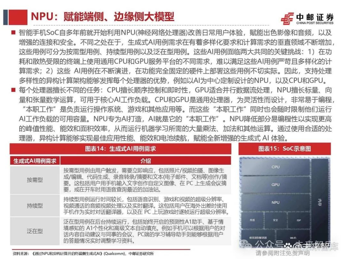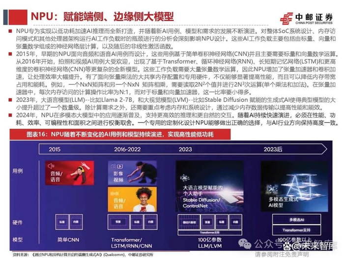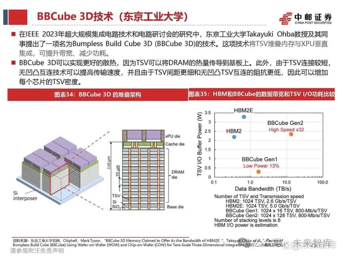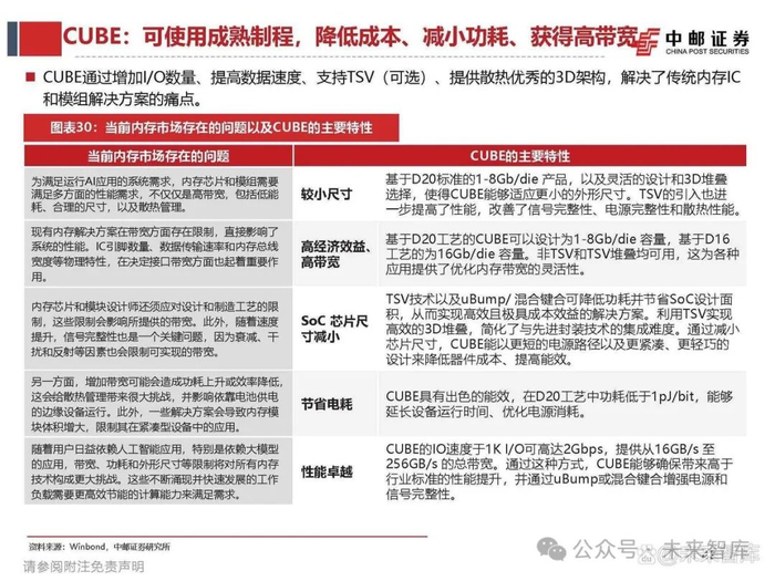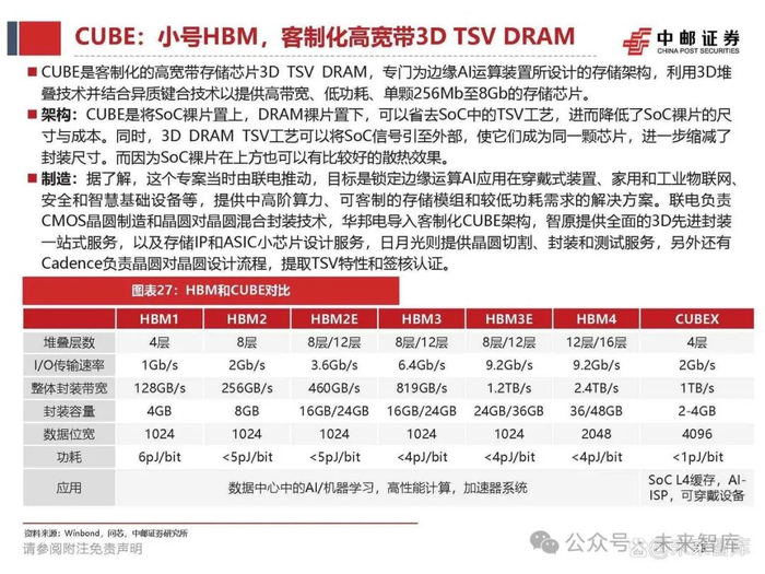 基于HBM和3D封装的AI芯片由于成本高、功耗高等因素,不适合端侧,CUBE作为一款高带宽、低功耗、紧 凑尺寸、极具成本效益,以及可定制化的为近存计算解决方案,可供模组制造商和SoC厂商直接部署,可以 满足端侧AI应用日益增长的需求。