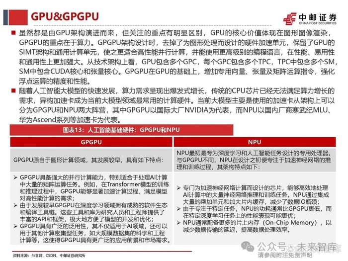 随着人工智能大模型的快速发展,算力需求呈现出爆发式增长,传统的CPU芯片已经无法满足算力增长的 需求,异构加速卡成为当前大模型领域最常用的计算硬件。当前大模型主要是使用的加速卡从架构上可以 分为GPGPU和NPU两大阵营,其中GPGPU以国际大厂NVIDIA为代表,而NPU以国内厂商寒武纪MLU、 华为Ascend系列等加速卡为代表。