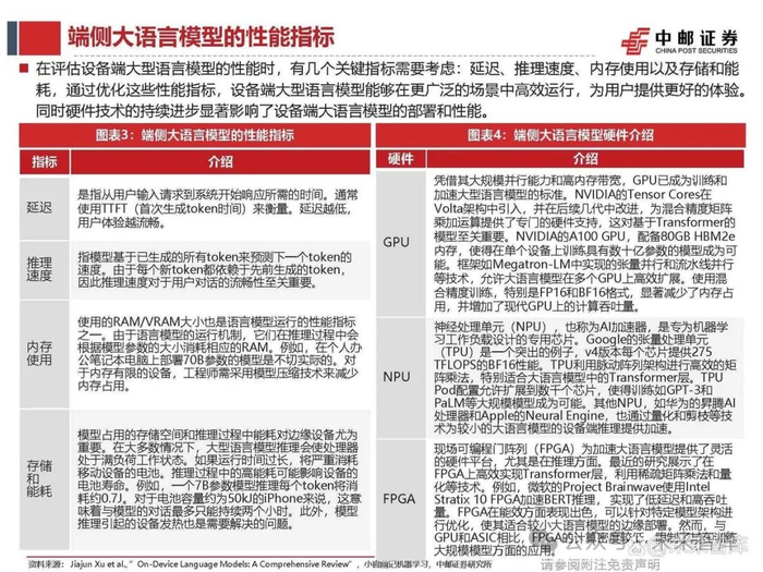 在评估设备端大型语言模型的性能时,有几个关键指标需要考虑:延迟、推理速度、内存使用以及存储和能 耗,通过优化这些性能指标,设备端大型语言模型能够在更广泛的场景中高效运行,为用户提供更好的体验。 同时硬件技术的持续进步显著影响了设备端大语言模型的部署和性能。