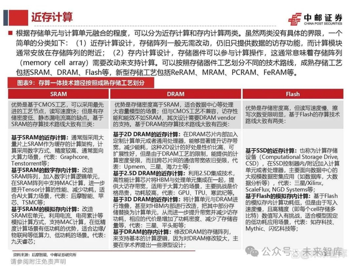 根据存储单元与计算单元融合的程度,可以分为近存计算和存内计算两类。虽然两类没有具体的界限,一个 简单的分类如下:(1)近存计算设计,存储阵列一般无需改动,仍旧只提供数据的访存功能,而计算模块 通常安放在存储阵列的附近;(2)存内计算设计,存储器件可以参与计算操作,这通常意味着存储阵列 (memory cell array)需要改动来支持计算。可以按照存储器件工艺划分不同的技术路线,成熟存储工艺 包括SRAM、DRAM、Flash等,新型存储工艺包括ReRAM、MRAM、PCRAM、FeRAM等。