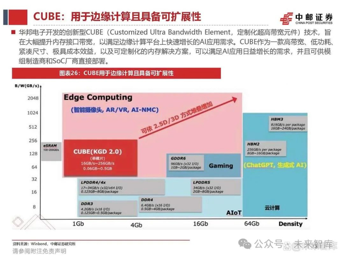 华邦电子开发的创新型CUBE(Customized Ultra Bandwidth Element,定制化超高带宽元件)技术,旨 在大幅提升内存接口带宽,以满足边缘计算平台上快速增长的AI应用需求。CUBE作为一款高带宽、低功耗、 紧凑尺寸、极具成本效益,以及可定制化的内存解决方案,可以满足AI应用日益增长的需求,并且可供模 组制造商和SoC厂商直接部署。
