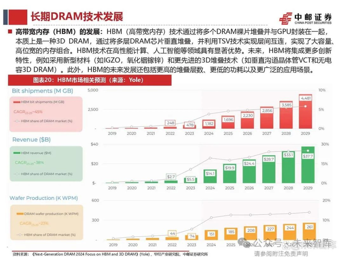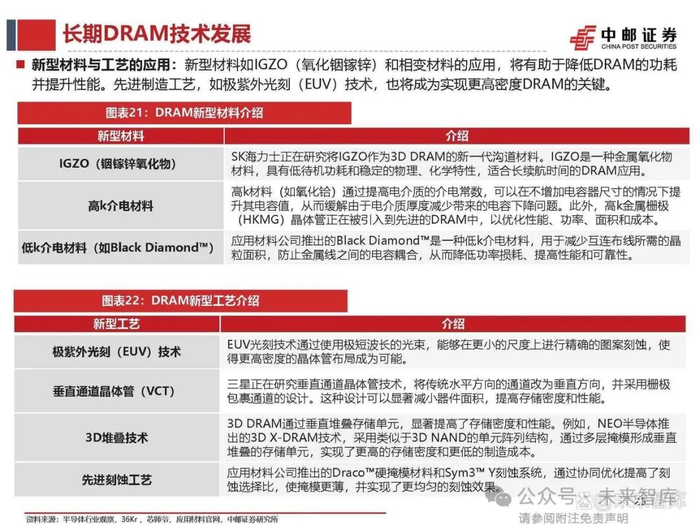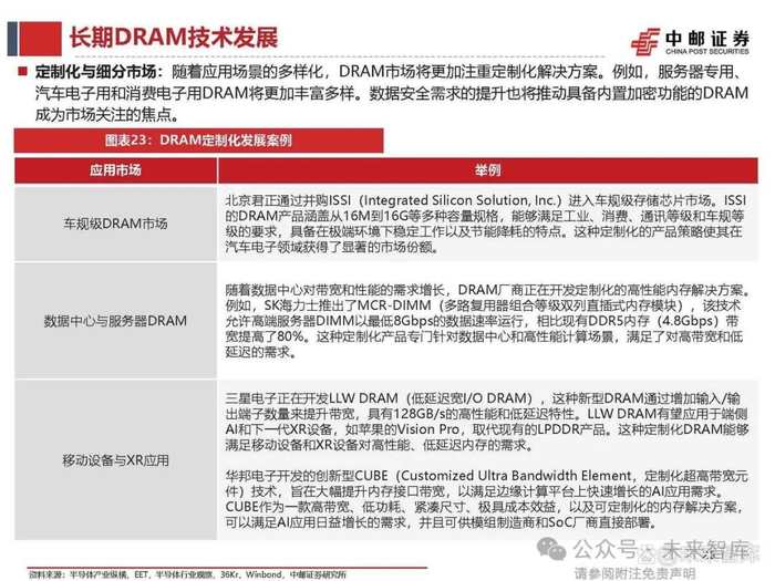 3D DRAM架构的兴起:为了进一步提升存储密度,3D DRAM架构成为未来的关键发展方向。3D DRAM 通过垂直堆叠存储单元,能够在不增加芯片面积的情况下显著提高存储密度。主要技术包括4F²垂直沟道晶 体管(VCT)、IGZO DRAM单元和3D堆叠DRAM单元等,这些技术将在10nm以下级别实现产品化。