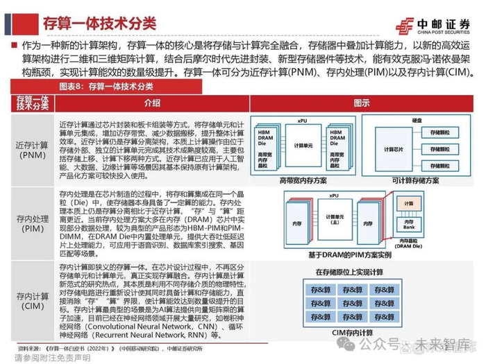 作为一种新的计算架构,存算一体的核心是将存储与计算完全融合,存储器中叠加计算能力,以新的高效运 算架构进行二维和三维矩阵计算,结合后摩尔时代先进封装、新型存储器件等技术,能有效克服冯·诺依曼架 构瓶颈,实现计算能效的数量级提升。存算一体可分为近存计算(PNM)、存内处理(PIM)以及存内计算(CIM)。