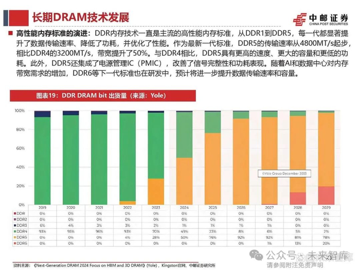 高性能内存标准的演进:DDR内存技术一直是主流的高性能内存标准,从DDR1到DDR5,每一代都显著提 升了数据传输速率、降低了功耗,并优化了性能。作为最新一代标准,DDR5的传输速率从4800MT/s起步, 相比DDR4的3200MT/s,带宽提升了50%。与DDR4相比,DDR5具有更高的速度、更大的容量和更低的功 耗。此外,DDR5还集成了电源管理IC(PMIC),改善了信号完整性和功耗表现。随着AI和数据中心对内存 带宽需求的增加,DDR6等下一代标准也在研发中,预计将进一步提升数据传输速率和容量。