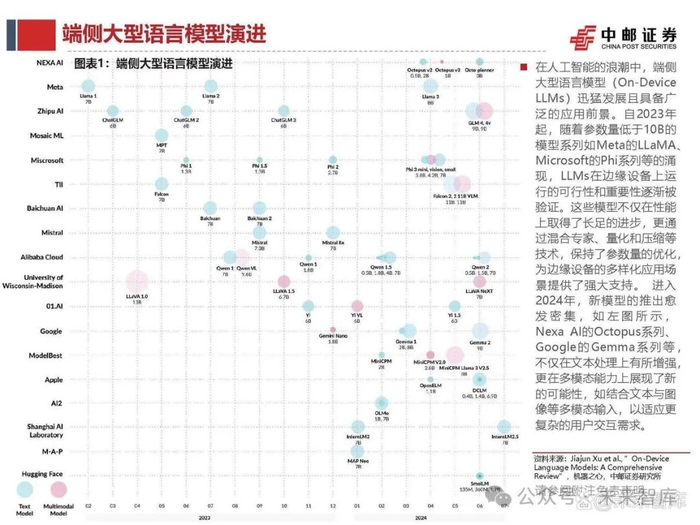 在人工智能的浪潮中,端侧 大型语言模型(On-Device LLMs)迅猛发展且具备广 泛的应用前景。自2023年 起,随着参数量低于10B的 模型系列如Meta的LLaMA、 Microsoft的Phi系列等的涌现,LLMs在边缘设备上运 行的可行性和重要性逐渐被 验证。这些模型不仅在性能 上取得了长足的进步,更通 过混合专家、量化和压缩等 技术,保持了参数量的优化, 为边缘设备的多样化应用场 景提供了强大支持。 进入 2024年,新模型的推出愈发密集 , 如左图所示 , Nexa AI的Octopus系列、 Google的Gemma系列等, 不仅在文本处理上有所增强, 更在多模态能力上展现了新 的可能性,如结合文本与图 像等多模态输入,以适应更 复杂的用户交互需求。