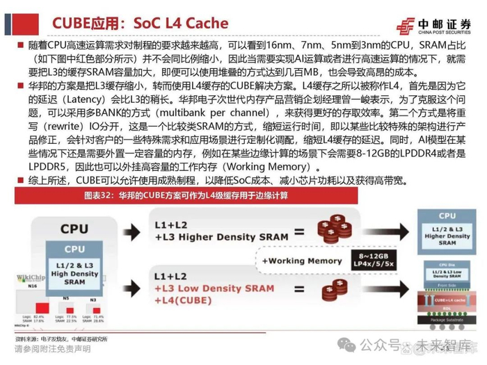 架构:CUBE是将SoC裸片置上,DRAM裸片置下,可以省去SoC中的TSV工艺,进而降低了SoC裸片的尺 寸与成本。同时,3D DRAM TSV工艺可以将SoC信号引至外部,使它们成为同一颗芯片,进一步缩减了 封装尺寸。而因为SoC裸片在上方也可以有比较好的散热效果。
