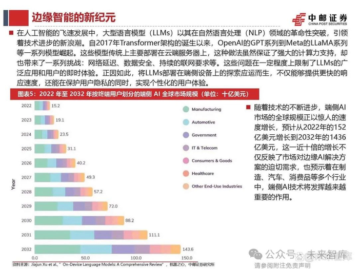 随着技术的不断进步,端侧AI 市场的全球规模正以惊人的速 度增长,预计从2022年的152 亿美元增长到2032年的1436 亿美元,这一近十倍的增长不 仅反映了市场对边缘AI解决方 案的迫切需求,也预示着在制 造、汽车、消费品等多个行业 中,端侧AI技术将发挥越来越 重要的作用。