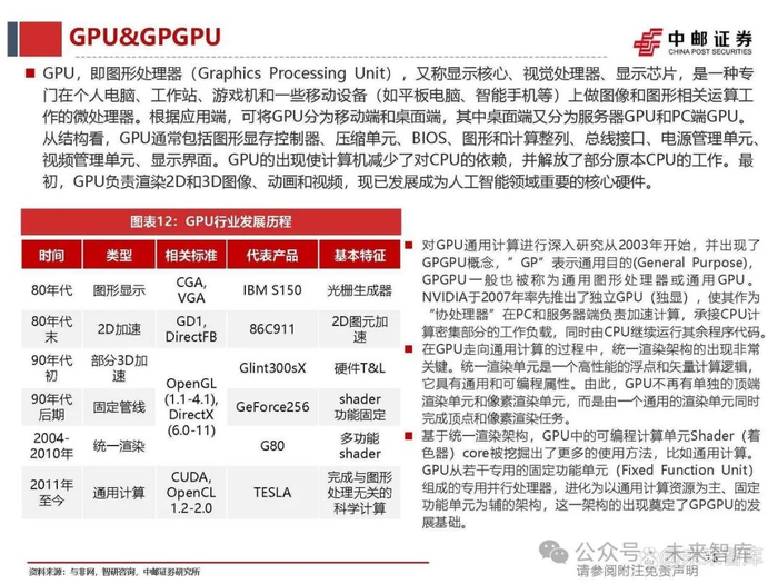 GPU,即图形处理器(Graphics Processing Unit),又称显示核心、视觉处理器、显示芯片,是一种专 门在个人电脑、工作站、游戏机和一些移动设备(如平板电脑、智能手机等)上做图像和图形相关运算工 作的微处理器。根据应用端,可将GPU分为移动端和桌面端,其中桌面端又分为服务器GPU和PC端GPU。 从结构看,GPU通常包括图形显存控制器、压缩单元、BIOS、图形和计算整列、总线接口、电源管理单元、 视频管理单元、显示界面。GPU的出现使计算机减少了对CPU的依赖,并解放了部分原本CPU的工作。最 初,GPU负责渲染2D和3D图像、动画和视频,现已发展成为人工智能领域重要的核心硬件。