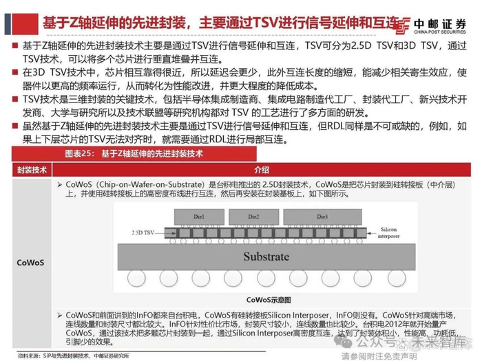 先进封装技术是半导体行业近年来的重要发展方向,旨在通过创新的封装架构和工艺,提升芯片性能、降低 功耗、减小尺寸,并优化成本。可以列出的先进封装相关的名称至少有几十种,为了便于区分,我们将先进 封装分为两大类:① 基于XY平面延伸的先进封装技术,主要通过RDL进行信号的延伸和互连;② 基于Z轴 延伸的先进封装技术,主要是通过TSV进行信号延伸和互连。