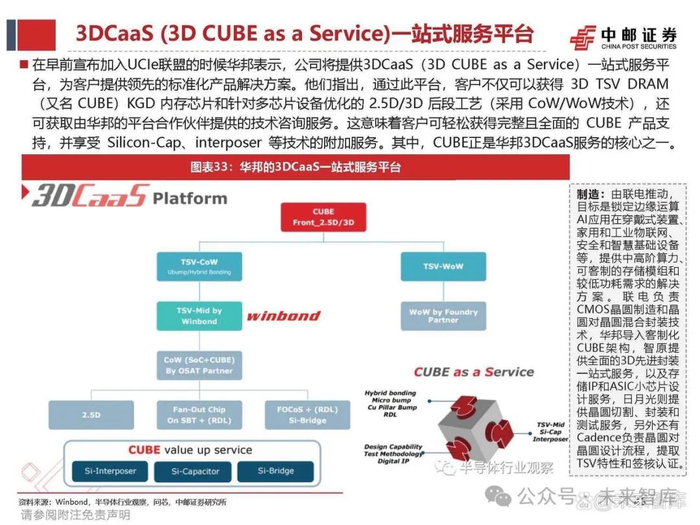 在早前宣布加入UCIe联盟的时候华邦表示,公司将提供3DCaaS(3D CUBE as a Service)一站式服务平 台,为客户提供领先的标准化产品解决方案。他们指出,通过此平台,客户不仅可以获得 3D TSV DRAM (又名 CUBE)KGD 内存芯片和针对多芯片设备优化的 2.5D/3D 后段工艺(采用 CoW/WoW技术),还 可获取由华邦的平台合作伙伴提供的技术咨询服务。这意味着客户可轻松获得完整且全面的 CUBE 产品支 持,并享受 Silicon-Cap、interposer 等技术的附加服务。其中,CUBE正是华邦3DCaaS服务的核心之一。