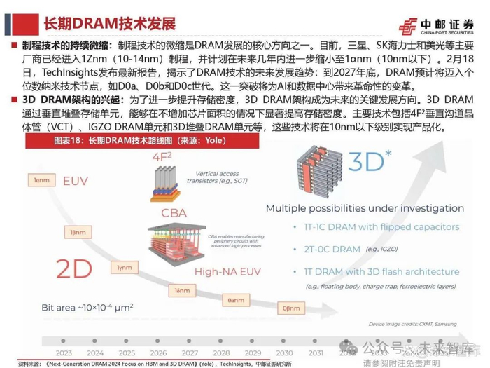制程技术的持续微缩:制程技术的微缩是DRAM发展的核心方向之一。目前,三星、SK海力士和美光等主要 厂商已经进入1Znm(10-14nm)制程,并计划在未来几年内进一步缩小至1αnm(10nm以下)。2月18 日,TechInsights发布最新报告,揭示了DRAM技术的未来发展趋势:到2027年底,DRAM预计将迈入个 位数纳米技术节点,如D0a、D0b和D0c世代。这一突破将为AI和数据中心带来革命性的变革。