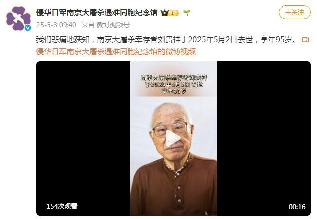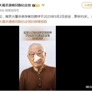 据侵华日军南京大屠杀遇难同胞纪念馆官方微博5月3日消息,我们悲痛地获知,南京大屠杀幸存者刘贵祥于2025年5月2日去世,享年95岁。