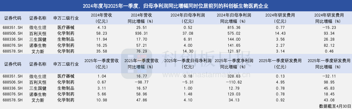 财联社星矿数据统计显示,从科创板生物医药企业2024年及2025年一季度归母净利润表现来看,微电生理、百利天恒、三生国健、诺泰生物、艾力斯等五家企业增幅引关注。