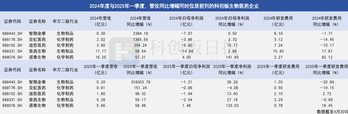 财联社星矿数据统计显示,从科创板生物医药企业2024年和2025年一季度营收同比增幅来看,智翔金泰、亚虹医药、迪哲医药、荣昌生物、诺泰生物五家企业相关经营数据同时位居前列。