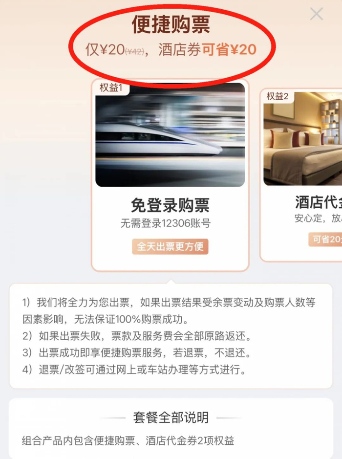 南国早报全媒体记者通过同程旅行小程序购票发现,在支付车票款时,部分选项会带有“便捷购票”“20元酒店券”等字样,但这些字样并不显眼。而只有点击“共2项”的服务时,才能看到“便捷购票”的详细说明。