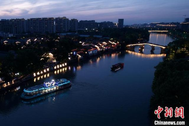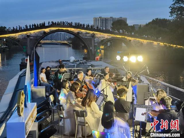 5月2日晚,浙江杭州,交响游船在拱宸桥前行驶。当晚,以“文艺赋美 运河有戏”为主题的流动音乐会在大运河上演。游船上,10多名弦乐演奏员现场带来《采茶舞曲》《蓝色多瑙河》等中外曲目。中新社发 葛松松 摄