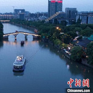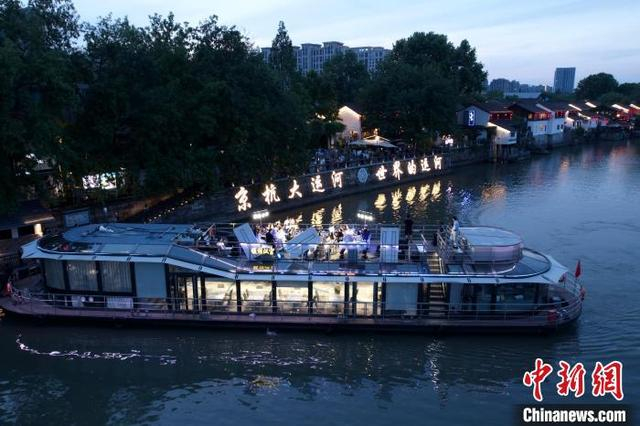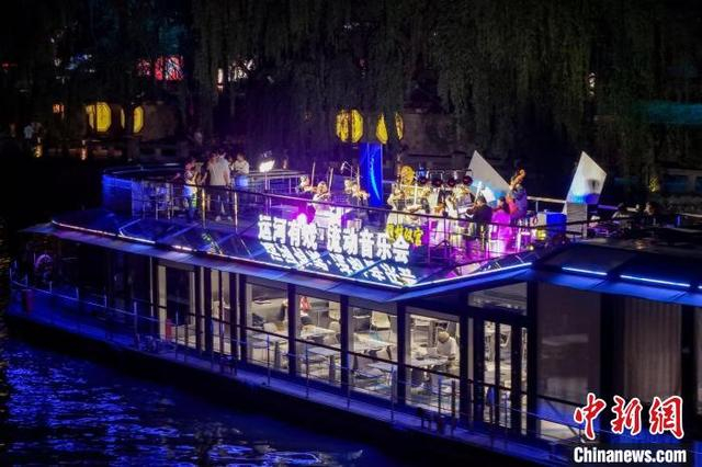 5月2日晚,浙江杭州,交响游船在大运河上行驶。当晚,以“文艺赋美 运河有戏”为主题的流动音乐会在大运河上演。游船上,10多名弦乐演奏员现场带来《采茶舞曲》《蓝色多瑙河》等中外曲目。中新社发 葛松松 摄