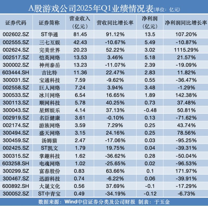 A股游戏公司Q1业绩“交卷”:完美世界营收重回前三,ST华通净利润居榜首