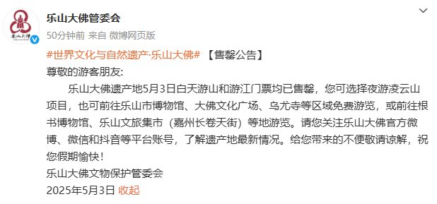 据乐山大佛管委会:乐山大佛遗产地5月3日白天游山和游江门票均已售罄,您可选择夜游凌云山项目,也可前往乐山市博物馆、大佛文化广场、乌尤寺等区域免费游览,或前往根书博物馆、乐山文旅集市(嘉州长卷天街)等地游览。