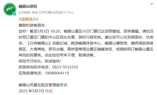 据峨眉山景区:截至5月3日10:20,峨眉山景区今日门票已达到预警线,即将售罄。请您及时预订景区门票和中山区观光车票,做好行程安排。建议您可以先到报国寺、伏虎寺、《只有峨眉山》戏剧幻城、数游峨眉体验中心、峨眉山博物馆、峨秀湖旅游度假区、大佛禅院、罗目古镇、高桥里等周边景区错峰游览,或提前预订峨眉山景区其他时段票务。