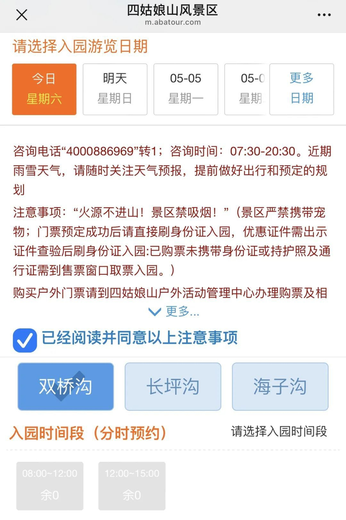 截至发稿时,四姑娘山景区双桥沟5月3日门票已售罄。