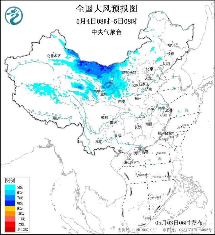 5月4日8时至5日8时,新疆东部、内蒙古中西部、青海东部和北部、甘肃大部、宁夏、陕西北部等地有5至7级、阵风8至10级、局地11级的大风。