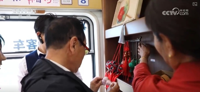 列车上,来自济南的老年艺术团在车厢里进行文艺演出,沂蒙小调、民族歌舞让列车上充满了欢乐的氛围。在另一边的功能车厢里,特色商品琳琅满目,旅客们可以在这里买到博山琉璃、潍坊窗花剪纸等当地特产。