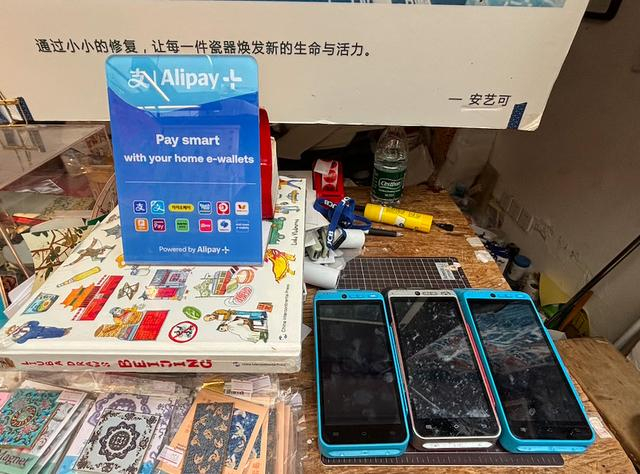 前门大街客流熙熙攘攘,其中就有不少金发碧眼的外国友人。杨梅竹斜街深处,一家名为乾坤空间的艺术文创店门口张贴着多种支付方式的标识,几位外国游客饶有兴致地选购有北京文化元素的陶瓷、刺绣、茶布、冰箱贴等纪念品。结账处,三台POS机都能刷Visa等外卡,支付宝国际版的立牌摆在桌上,店家备足了零钱用来找零。