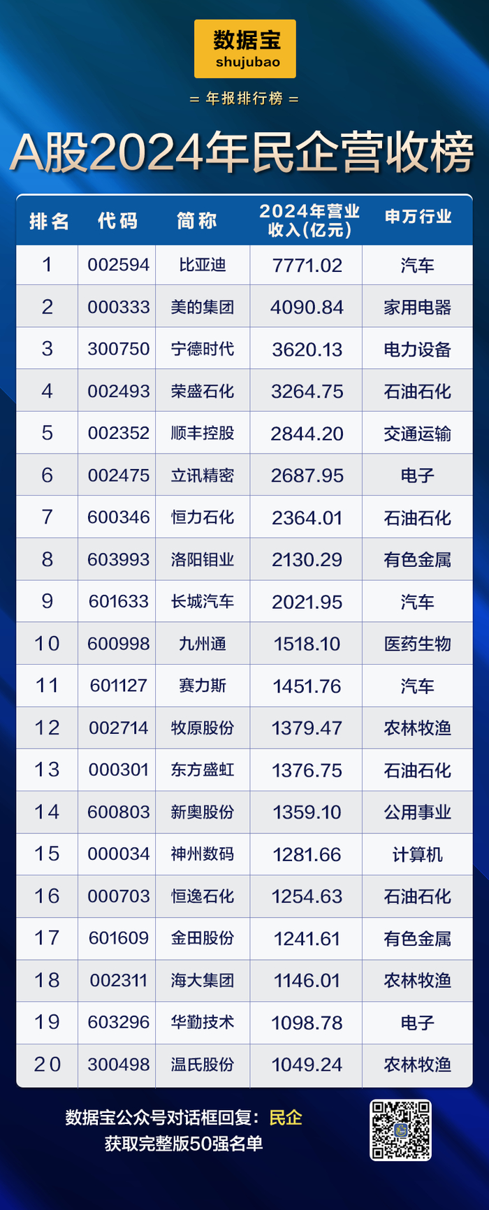 数据宝根据条件:2022年至2024年营业收入持续超过50亿元(参考A股民企平均营收规模);2021年至2024年持续盈利,且截至2024年过去3年净利润复合增速超过10%;2022年至2024年研发强度持续超过4%(参考A股民企整体研发强度)筛选出《A股民企综合竞争力50强》,入围公司主要分布于申万二级电池、汽车零部件、消费电子、通信设备等行业。