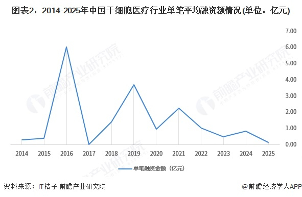2014-2024年,中国干细胞医疗行业单笔平均投融资金额波动增长,2016年大幅增长至6亿元以上,2024年,我国干细胞医疗行业单笔平均投资额为0.83亿元。