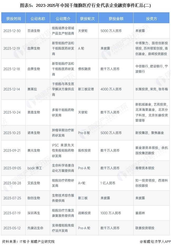 由于行业发展的重要性,中国干细胞医疗近年来不断发展,投融资事件较多,主要业务集中在治疗技术研发和药物研发等领域。2023-2025年我国干细胞医疗行业代表企业的主要投融资事件如下:
