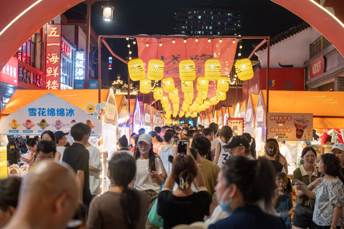 夜市将城隍庙文化和当下新消费体验融合,集沉浸式演艺、网红地标打卡等复合消费业态,丰富了游客的夜间生活。