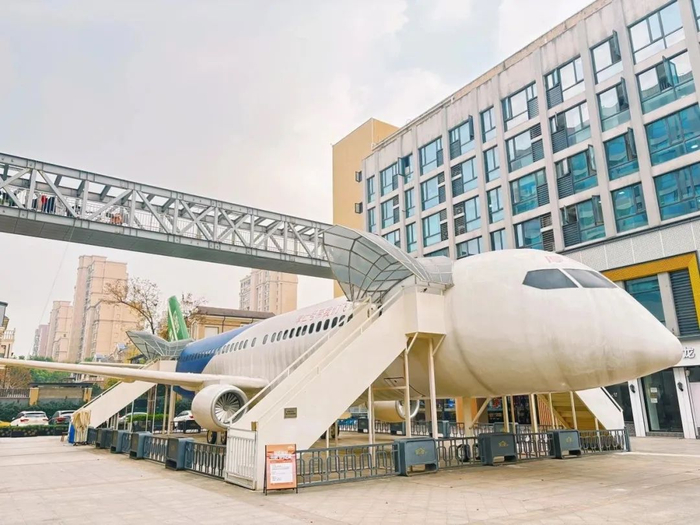 商业街的广场上矗立着一架1:1还原的飞机模型,钻进驾驶舱,全仿真的仪表盘、操纵杆等一应俱全。不少游客纷纷赶去打卡,体验一把当机长的感觉!