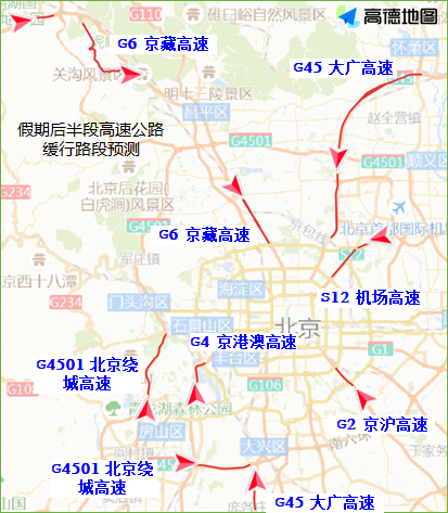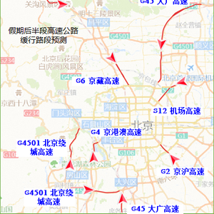 假期后半段,京藏、京承、京港澳、京沪、京开、机场等高速和部分国道进京方向的交通压力将有所增加,其中京藏高速康庄到陈庄、回龙观到上清桥,京承高速麒麟楼隧道到司马台立交桥、杨雁桥到望和桥,京港澳高速健康城收费站到房山梨园桥、周口店路出入口到大瓦窑桥,京开高速菜户营桥区、天宫院桥区等路段节点容易出现车辆排队情况,下午13至20时通行压力将尤为突出。