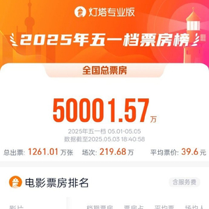 2025五一档电影票房破5亿 界面新闻 界面新闻官方账号 2025.05.0318:51 关注 据灯塔专业版,截至5月3日18时40分,2025年五一档(5月1日-5月5日)档期内总票房(含预售)突破5亿,影片《水饺皇后》《猎金·游戏》《幽灵公主》暂列前三名。