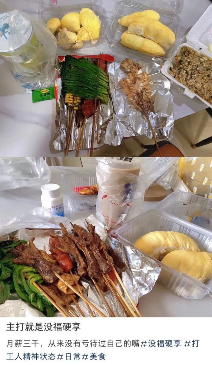 “本来工资就不高,想买房买车基本是天方夜谭了,上班压力还大,时不时就会憋一肚子气,再加上自己一人在外地无依无靠,再不从吃上犒劳一下,这日子过的其实不比‘没苦硬吃’好多少。”