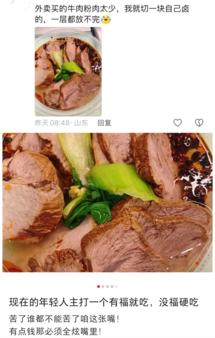 “每次看到外卖的起送价50元,我不是想着‘算了,不点了’,而是心里默默想着,‘太好了,明天还可以继续吃!’花的钱也不多,能吃两三天,换算下来其实一天也没花多少。我知道有人觉得这可能是‘消费主义’,但对我来说,这只是‘宠自己’的小确幸。生活已经够忙了,偶尔给自己一点小幸福,难道不应该理所当然吗?”